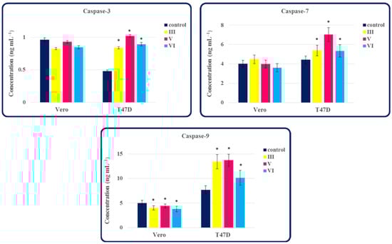 2.3. The Ability of Compounds III, V and VI to Activate Caspase-3, -7 and -9 in Normal Cells and Tumor Cells of the Breast