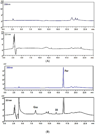The accuracy (%), i.e., relative recovery, compare the measured concentration with the actual concentration to obtain the method recovery rate, the difference value is the relative recovery rate. The recovery rates of PUR for low, medium and high (0.1, 5, 100 μg·mL−1) concentrations were 104.44%, 105.01%, and 100.17%, respectively; the recoveries for low, medium, and high concentrations of GAS were 108.71%, 107.16%, and 99.87%, respectively.