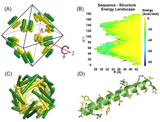 Computational design of peptidic coiled-coil cages: (A) asymmetric unit (dimer) contains one helix in green and one helix in yellow. This dimer is rotated by an angle of θ and translated by distance R along the axis vector. The cage is generated by applying the symmetry operations of the Oh point group. The two helices in the asymmetric unit are located in distinct local environments, where the yellow helices make up the inner layer of the cage, and the green helices make up the outer layer of the cage; (B) sequence–structure landscape; average energy over sequences and all allowed side-chain conformations as a function of R and θ; (C) structure of peptide cage at R = 30 Å and θ = 44°; and (D) most probable structure of the two chains in the asymmetric unit after sequence design imposing sequence symmetry constraints. Not all amino acids have identical side-chain conformations.