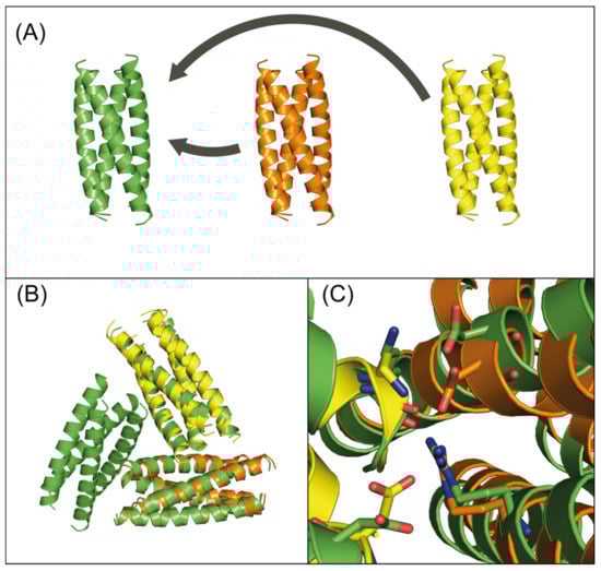 - Rhys, G.G.; Wood, C.W.; Lang, E.J.M.; Mulholland, A.J.; Brady, R.L.; Thomson, A.R.; Woolfson, D.N. Maintaining and Breaking Symmetry in Homomeric Coiled-Coil Assemblies. Nat. Commun. 2018, 9, 4132. [Google Scholar] [CrossRef]