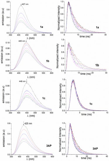 Figure 4. Emission spectra (left) and fluorescence decays (right) for compounds 1ac and 3AP obtained in PBS (0.1 mM) in the presence of increasing amounts of ETPP (0–42.1 mM; colour codes: 0 mM black line, 4.6 mM red line, 11.4 mM blue line, 22.2 mM pink line, 32.4 mM green line, 42.1 mM navy blue line).
