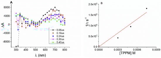 To evaluate the reactivity of the solvated electron with ETPP, the quenching rate constant was determined. Hence, the decay was monitored at 700 nm upon the addition of increasing amounts of ETPP (Figure 5B inset). The corresponding rate constant value was obtained from the slope of the linear plot by representing reciprocal lifetime versus ETPP concentrations (Figure 5B). The quenching rate constant obtained for the reaction of the solvated electron with ETPP was kq = 2.2 × 108 M−1s−1.