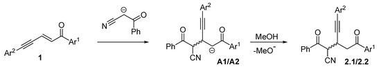 A plausible reaction mechanism is given in Scheme 2. The reaction starts from regioselective Michael addition of 3-oxo-3-phenylpropanenitrile anion to the double carbon–carbon bond of starting enynone 1. At this stage, the anion may attack from both sides of the C=C bond plane, that gives rise to diastereomeric anions A1/A2. Protonation of the latter affords finally diastereomers of δ-diketones 2.1 and 2.2.
