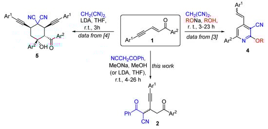 Summarizing the date described in this paper and our previous results on reactions of enynones 1 with malononitrile CH2(CN)2 [3,4], one may state that, depending on the used CH-acid (CH2(CN)2 or NCCH2COPh) and nucleophilicity/basicity of the anionic reagent (RO− or i-Pr2N−), various reaction products may be obtained 2, 4 or 5 (Scheme 4). The use of strong basic and high nucleophilic alkoxide anions RO− lead to an involvement of this species in the structure of reaction products, pyridines 4 [3]. On the other hand, the use of less nucleophilic anion i-Pr2N− (due to its large spatial volume), directs the reaction into another pathway with a formation of cyclohexanes 5 [4]. It should be noted that both CH-acids, CH2(CN)2 and NCCH2COPh, give Michael addition product to the C=C bond of substrates 1 at first stages of these reaction. However, this reaction is stopped for NCCH2COPh at this step, and goes further for CH2(CN)2. That is caused by stronger electron acceptor properties of the CN group compared to COPh one. Due to that, there is a possibility of generating of secondary carbanionic species in reactions with CH2(CN)2. See discussions on the reaction mechanisms in our works [3,4].
