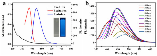 UV-vis and fluorescence spectra were investigated to further observe the optical behavior of the FW-CDs. The UV–vis spectrum of the FW-CDs (the black line in Figure 2a) showed two absorption peaks centered at 258 nm and 330 nm, which might be caused by the π-π* energy transition of conjugated C=C bonds [58] and the n-π* transition of the structure of the C=O/C=N groups [59]. On the other hand, Figure 2a shows that the FW-CDs had the strongest fluorescent emission at 445 nm under 375 nm excitation. Accordingly, as shown in the inset of Figure 2a, the FW-CDs solution was nearly colorless under visible light, while it exhibited a bright blue fluorescence when illuminated with a UV lamp (365 nm). Additionally, the fluorescence response behavior of the FW-CDs was further explored. The excitation and emission of FW-CDs was measured in the range of 330–420 nm. As exhibited in Figure 2b, an obvious red-shift of the emission wavelength of FW-CDs appeared when the excitation wavelength increased with the interval of 10 nm. This excitation-dependent phenomenon might be assigned to the heterogeneous structure and surface state of the FW-CDs [60]. Additionally, the fluorescence quantum yield of FW-CDs was calculated to be 14.8% using the reference quinine sulfate.