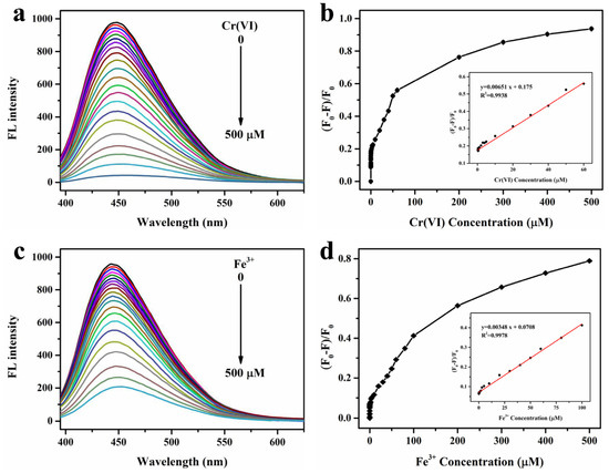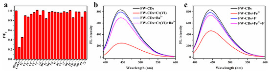 Encouraged by a large number of functional groups existing on the surfaces of FW-CDs and the previous works indicating that many waste-biomass-derived CDs had a selective fluorescence response towards metal ions, we speculated that FW-CDs could also be utilized for sensing metal ions. In order to confirm this conjecture, different metal ions and anions of the same concentration (300 µM) were added for exploring the ion selectivity of FW-CDs, including K+, Na+, Fe2+, Fe3+, Cu2+, Ag+, Pb2+, Cd2+, Co2+, Ni2+, Mn2+, Zn2+, Mg2+, Ba2+, Ca2+, Al3+, Hg2+, Cr(VI), Cl−, CO32−, S2O32−, IO4− and SO42−. As depicted in Figure 3a, except for Fe3+ and Cr(VI), there was almost no significant fluorescence-quenching caused by other ions, demonstrating that the as-prepared FW-CDs had great potential to be applied in the specific assay of Cr(VI) and Fe3+.