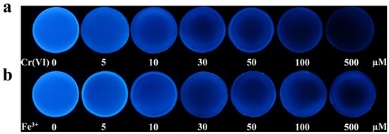 In order to verify the feasibility of this visual sensing system, the FW-CD-doped hydrogels were immersed in the test solutions containing different kinds of metal ions (100 µM). As shown in Figure 6, after soaking for 10 min, the fluorescence of FW-CD-based hydrogels was distinctly weakened in the solution of Cr(VI) and Fe3+, while only a slight quenching was observed in the presence of other kinds of metal ions. Thus, the FW-CD-based hydrogel sensor possesses excellent selectivity for the determination of Cr(VI) and Fe3+. The sensitivity of the FW-CD-based hydrogel sensor was evaluated as well. Briefly, the FW-CD-doped hydrogels were immersed in the test solutions containing various amounts of Cr(VI) or Fe3+. As shown in Figure 7, with the increase in Cr(VI) or Fe3+ content from 5 to 500 µM, their fluorescence intensity continuously decreased. The fluorescence changes of the hydrogels caused by 10 µM Cr(VI) or 5 µM Fe3+ in particular, which were close to their maximum limit, could be easily distinguished by the naked eye, implying good sensitivity of the FW-CD-based hydrogel sensor. Next, the environmental water sample was utilized to assess the anti-interference capability of the visual sensing system. As exhibited in Figure 6, a slight change was observed when the FW-CD-based hydrogels were placed in the river water sample, indicating that the potential interference in a real complex sample caused by other metal ions on the visual sensing could be ignored. Furthermore, the effectiveness of the dual-masking strategy for avoiding the mutual interference of Cr(VI) and Fe3+ in the visual detection process was further explored. As exhibited in Figure 6, the quenched fluorescence of FW-CD-based hydrogels induced by Cr(VI) and Fe3+ was well recovered after adding Ba2+ and F−, respectively, suggesting that the FW-CD-based fluorescent hydrogel sensor holds huge application value for the parallel and visual sensing of Cr(VI) and Fe3+.