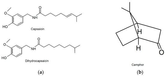 Structural formulas of (a) capsaicin, dihydrocapsaicin, and (b) camphor.