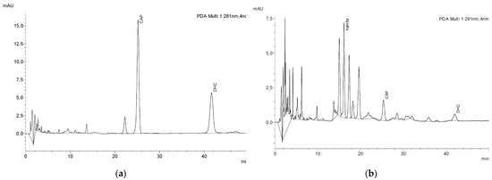 Chromatogram of extracted (a) capsicum oleoresin (raw material) and (b) finished product.