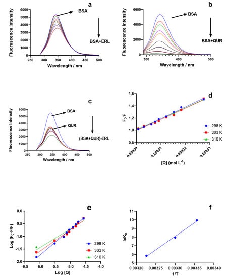 The fluorescence spectra for BSA (1.5 μM) with: (a) ERL (0.00–27.5 μM); (b) QUR (0.00–35 μM); (c) QUR (5.5 μM)-ERL (0.00–27.5 μM) at (λex = 280 nm and λem = 300–500 nm); (d) Stern Volmer Plot for BSA(1.5 μM) -ERL (0.00–27.5 μM system at a temperature of 298, 303, 310 K; (e) double reciprocal plot [(F0 − F)/F] versus log [Q] for the BSA-ERL system to obtain the binding constant (b); (f) van’t Hoff plots to obtain the for thermodynamic parameters for the BSA-ERL system interaction.