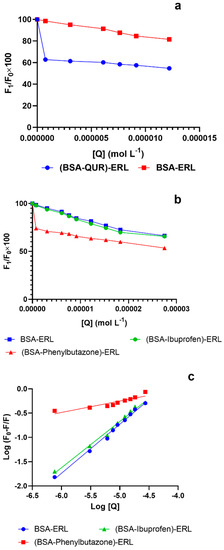 The binding Site for ERL was identified using phenylbutazone and ibuprofen as site-specific markers for Site I and Site II of BSA, respectively. Quenching curve and binding constants of the BSA-ERL system in the presence of site markers were compared to the binding constant of the BSA-ERL system in the absence of site markers. Ibuprofen presence did not influence the quenching behavior of the BSA-ERL system (Figure 2b), and binding constants in the presence and absence of ibuprofen were similar (Table 2). Thus, these results rule out the binding of ERL to BSA Site II. However, the presence of phenylbutazone in the BSA-ERL system strongly influenced the quenching behavior and the binding constant of the BSA-ERL system (Figure 2c). Hence, it was concluded that ERL binds to Site I of BSA. Furthermore, since QUR also binds to Site I of BSA [43,47], the presence of QUR in the BSA-ERL system can markedly influence the interaction between the BSA-ERL system.