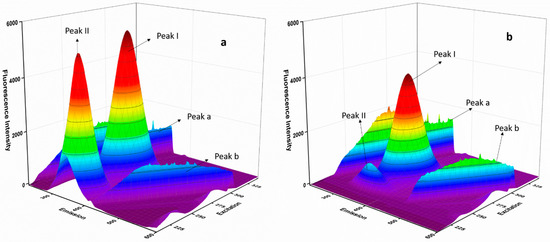 Three-dimensional fluorescence spectra for BSA (a) and BSA-ERL system (b).