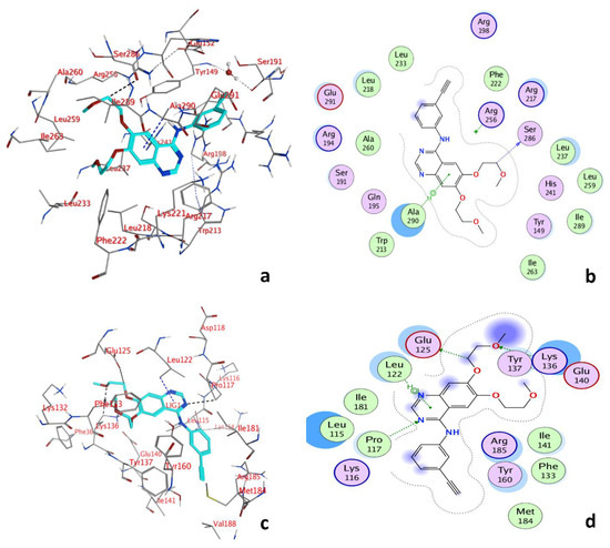 Molecular docking conformation for the interaction of ERL to Site I and Site III of BSA is given in Figure 5a,c. The binding energy for Site I −33.63 kJ·mol−1 was lower than the binding energy −29.91 kJ·mol−1 for Site III of BSA. The binding pocket of Site I of BSA (Figure 5b) was surrounded by Glu291, Leu218, Leu233, Arg198, Phe222, Arg256, Arg217, Ser286, Leu237, Leu259, His241, Ile289, Tyr149, Ile263, Ala290, Trp213, Gln195, Ser191, Ala260, Arg194, and the amino acids that surrounded the binding pocket at Site III were Lys 116, Pro117, Leu115, Ile181, Leu122, Glu125, Tyr137, Lys136, Arg185, Ile141, Tyr160, Phe133, Met184. Furthermore, the fluorophore residues Trp213, Tyr149, and Phe222 were found in the vicinity of the binding pocket. Thus, the interaction of ERL with BSA might influence these fluorophore residues. In addition, the hydrogen bond between Ligand C19 and Ser286, 3.41 Å, and pi hydrogen bond between 6-ring and Ala290, 3.79 Å were also observed in the BSA-ERL interaction. The BSA-ERL interaction was also investigated for any changes in the presence of QUR. In this study, three hydrogen bonds, Ligand C15 and Phe133, 2.95 Å, Ligand O3 and Phe133, 2.65 Å, Ligand O4, and Lys136, 3.08 Å, were found. In addition, two pi-H bonds 6-ring and Leu115, 4.16 Å, 6-ring and Leu122, 3.90 Å, were observed.
