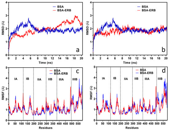The conformation stability for the BSA-ERL system was studied with MDS. The MDS study was conducted for Site I and Site III of BSA with ERL. The complex’s stability was evaluated based on the root mean square deviation (RMSD) and root mean square fluctuation (RMSF) studies. The RMSD studies for BSA and BSA Site I and Site III with ERL are provided in Figure 6a,b, respectively, whereas the RMSF plots are given in Figure 6c,d, respectively. The most critical deviations from the crystal structure are found at the residue level in the most mobile parts of the protein, i.e., loops, terminal regions, and helix ends. In contrast, the transmembrane segments remain stable in all the simulations.