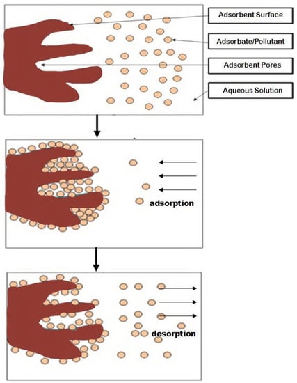 Adsorption processes (Figure 1) are among the most prominent methods for treating contaminated solutions. In terms of metals removal, this method involves the accumulation of metal ions onto adsorbent pores and surfaces forming a layer consisting of metal ions, along with other pollutants [6,60]. Adsorption is relatively simple. It has also great removal efficiency, and less energy and chemicals consumption, however, its material preparation and regeneration process should be further concerns [61]. Recently, the utilization of biomass and other natural materials has been increasing due to their potential, eco-friendliness and cost-effectiveness [4]. Various low-cost material-based adsorbents like clays, zeolites, plants and agricultural wastes as well as animal residues have been reported to be competitive and promising [4,62,63,64,65].