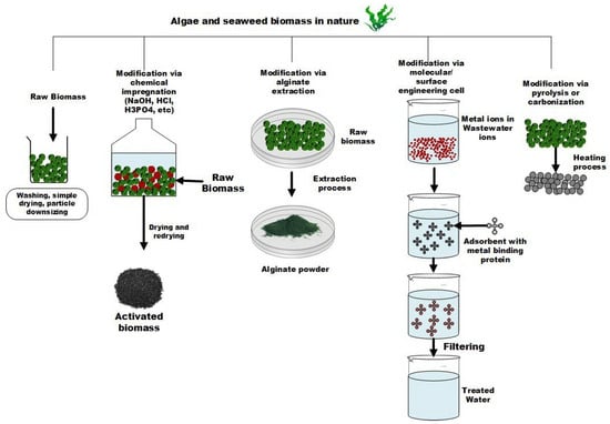 Raw biomass should be prepared properly before applying it as an adsorbent. The preparation processes can include physical, thermal, chemical, or combined activation methods. In terms of physical treatment, there are some standard techniques that can be applied such as washing, moderate drying, grinding, or downsizing biomass particles. The range of drying temperature should normally be set below 100 °C considering the natural characteristics of biomass, and this method may not need special techniques like chemical impregnation and magnetization [75]. Therefore, most studies start by synthesizing the bio-adsorbent through some defined physical procedure(s). The next step is thermal or heat treatment. In this case, a high amount of energy is usually needed for activating biomass. Biomass after heat treatment would have a higher surface area and more active sites available on its surface leading to higher adsorption capacity. Generally, pyrolysis processes for biomaterials are conducted at temperatures below 800 °C. This then can be followed by chemical modification to provide more and stronger active sites on the carbonized surface [76]. Chemical treatment that can be implemented as either sole or hybrid activation methods to amplify the affinity of adsorbent to adsorb metal ions through electrostatic interaction correlating to the distribution number of functional groups as well as the surface charge alteration for adsorption improvement [77]. The preparation methods applied for algae and seaweed-based adsorbent are illustrated in Figure 2.