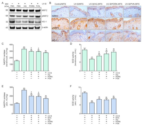 Next, we evaluated whether NRF2 and HO-1 increased in the UV-B-radiated animal skin and decreased after PVN treatment (Figure 1B and Supplementary Figure S3C,D). To increase the penetration of PVN into the skin, we used a MTS. Moreover, we also delivered distilled water via MTS in the control or UV-B-radiated animal groups to minimize the bias which possibly caused by using MTS only in the experimental groups (HQ, PDRN, and PVN treated groups). The expression of pNRF2/NRF2 in the epidermis of UV-B-radiated animals was significantly lower than that of control animals (Figure 1B and Supplementary Figure S3C). The same expression significantly increased in response to the topical application of HQ, PDRN, and PVN. The increasing effect of the PVN was significantly higher than those of PDRN or HQ.