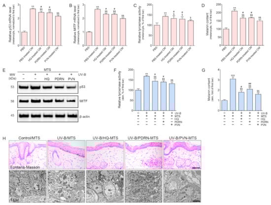 Regulation of the expression of p53 and MITF and tyrosinase activity by HQ, PDRN, and PVN treatment. (A,B) The mRNA expression levels of p53 (A) and MITF (B) were determined in the melanocytes treated with PBS or CM from UV-B-radiated keratinocytes. CM was obtained from a UV-B-radiated keratinocyte culture treated with HQ, PDRN, or PVN. The mRNA levels were normalized by Actb and expressed relative to the levels in the PBS group. (C,D) The tyrosinase activity (C) and melanin contents (D) determined in the melanocytes treated with PBS or CM from UV-B-radiated keratinocytes. (E) Immunoblot analysis of p53 and MITF determined in the UV-B-radiated animal skin. (F) The tyrosinase activity was evaluated in the UV-B-radiated animal skin. (G) The melanin contents evaluated with Fontana–Masson staining in the UV-B-radiated animal skin was exhibited as a graph. (H) The melanin content was assessed by Fontana–Masson staining (upper row; scale bar = 100 µm) and TEM (lower row; scale bar = 5000 nm). Melanin is stained as blackish dots in the Fontana–Masson staining. Data are presented as the mean ± standard deviation: **, p < 0.01 and ***, p < 0.001 vs. first bar; $, p < 0.05 and $$, p < 0.01 vs. second bar; #, p < 0.05 and ##, p < 0.01 vs. 5th bar (Mann–Whitney U test). CM, conditioned medium; HQ, hydroquinone; MITF, microphthalmia-associated transcription factor; MTS, microneedling therapy system; MW, molecular weight; PBS, phosphate-buffered saline; PDRN, polydeoxyribonucleotide; PVN, polydeoxyribonucleotide + vitamin C + niacinamide; p53, tumor protein p53; TEM, transmission electron microscopy; UV-B, ultraviolet B.