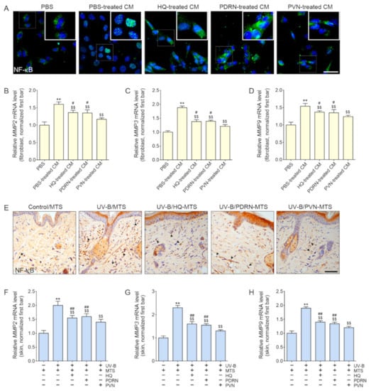The expression of NF-κB in fibroblasts increased in response to the application of CM from UV-B-radiated keratinocytes (Figure 3A and Supplementary Figure S5A). However, the expression significantly decreased in response to the application of CM from HQ-, PDRN-, and PVN-treated UV-B-radiated keratinocytes.