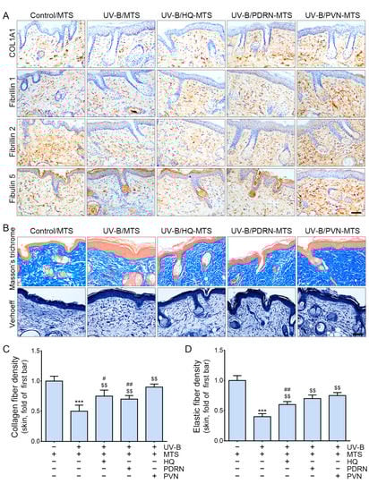 The amount of collagen fiber evaluated by Masson’s trichrome staining significantly decreased in response to UV-B and significantly increased in response to topical application of HQ, PDRN, and PVN (Figure 4B,C). The most prominent increasing effect was shown for PVN.