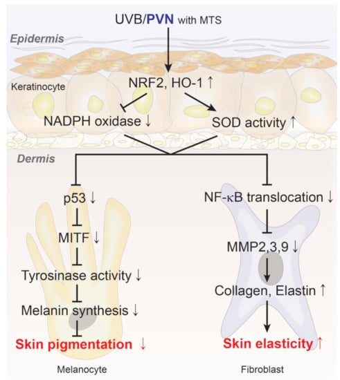 In conclusion, PVN, which is a mixture of PDRN, vitamin C, and niacinamide that was applied topically to skin via a MTS, showed decreased melanin synthesis and accumulation in the skin by decreasing oxidative stress. The PVN increased the expression of collagen and elastin fibers by decreasing MMPs and increasing elastin fiber synthesis in UV-B-radiated skin (Figure 5).