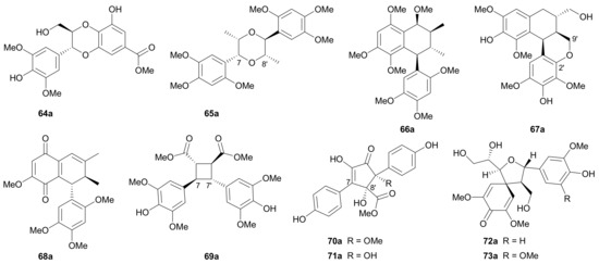 The unusual dinorneolignans 64a/64b incorporating a 1,4-dioxane motif and the arylnaphthalene-type lignans 67a/67b bearing a 2′,9′-epoxy ring were separated from Pithecellobium clypearia in 2018, with their abs. configs. being determined by the TDDFT-ECD method [51]. In 2015, Zhang et al. reported a pair of 7,8′-epoxy-8,7′-oxyneolignans (65a/65b) and a pair of oxidized arylnaphthalene-type lignans (68a/68b) from Acorus tatarinowii, and the abs. configs. of the two pairs were established by employing the TDDFT-ECD method and comparing the Cotton effect at 315 nm with those of known analogues, respectively [38]. The other pair of enantiomeric arylnaphthalenes 66a/66b were also isolated from Acorus tatarinowii, with their abs. configs. being assigned by comparing the Cotton effect at 285 nm with those of known analogues [28]. Compounds 69a/69b featuring a cyclobutane ring via 7,7′ and 8,8′ connections represent a pair of [2 + 2] cycloaddition adducts of two phenylpropanoid units and were obtained from Isatis indigotica in 2019 [52]. Isolated from Tylopilus eximius in 2012 are two pairs of enantiomers 70a/70b and 71a/71b both incorporating a cyclopentenone ring formed by 7,8′ and 9,7′ linkages [53]. The rel. config. of racemic 71 was established by X-ray crystallography, while the abs. configs. of 70a/70b and 71a/71b were confirmed by TDDFT-ECD method. In 2015, two pairs of rare spirodienone neolignans (72a/72b and 73a/73b) were reported from Cinnamomum subavenium, with the absolute structures being elucidated by X-ray crystallographic analysis and TDDFT-ECD method [54].