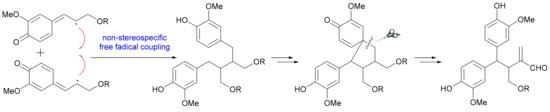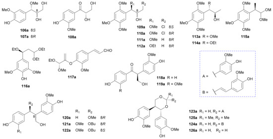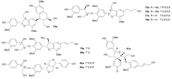 8,4′-Oxyneolignans. 8,4′-Oxyneolignans (for structures, see Figure 1; for names, see Table S1 in Supplementary Materials) are formed via 8-O-4′ ether bonds. Also, the C-7 in these lignans is usually oxidized in a nonstereoselective manner. Then, erythro- or threo-isomers are generated, leading to the occurrence of two pairs of enantiomers.