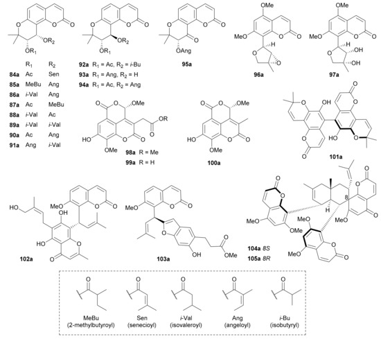 Compounds 84a−87a are a group of angular dihydropyranocoumarins and were obtained as 3′S,4′S-configured pure enantiomers from Peucedanum japonicum in 2017 [58], while their corresponding 3′R,4′R-enantiomers (84b−87b) had been previously reported from Angelica morii in 1974 [59], Peucedanum praeruptorum in 2012 [60], Seseli gummiferum in 1971 [61] and Angelica furcijuga in 2000 [62], respectively. Another eight pairs of analogues 88−95 were found to be present as scalemic mixtures in Peucedani Radix [63] and were successfully separated into pure enantiomers for the first time. Except 88a, 89b, 92a and 92b, the others have been formerly reported as optically pure compounds [63], but the small [α]D values compared with those for the purified enantiomers suggested their scalemic natures. Tang and coworkers isolated two pairs of coumarin enantiomers (96a/96b and 97a/97b) from Toddalia asiatica and assigned the rel. and abs. configs. of 96a/96b via X-ray diffraction experiment and TDDFT-ECD method, respectively [64]. From Sapium baccatum, three coumarin enantiomer pairs incorporating one additional α-pyrone ring (98−100) were assigned the abs. configs. by comparing their specific optical rotations with those of known analogues [65]. Compounds 102 and 103 are two pairs of hybrid dimer enantiomers from Cnidium monnieri and they were also total synthesized for further biological test [66]. The most complex coumarin enantiomers so far are the oligomeric coumarin hybrids 104 and 105 bearing a spirodienone-sesquiterpene skeleton, and they were isolated from Toddalia asiatica in 2016 [67]. The only coumarin enantiomers generated by axial chirality are the prenylated coumarin dimers 101a/101b, with the abs. configs. being determined by TDDFT-ECD method [68].