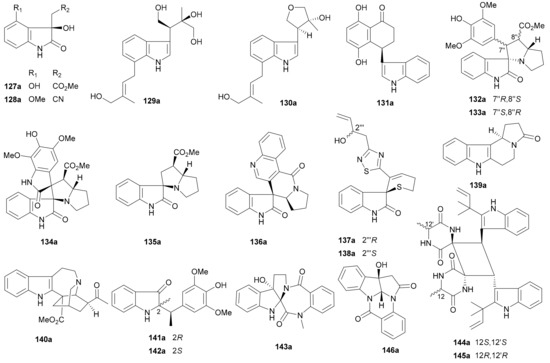It is interesting to note that suitable crystals for X-ray diffraction analysis of the enantiomeric mixtures seem relatively easy to be obtained in these reports, but the acquisition of high quality crystals of pure single enantiomers appears difficult. As above described, from simple indoles (e.g., 127) to monoterpenoid indole hybrids (e.g., 140), from single indoles (e.g., 129) to dimeric indoles (e.g., 134), from one-chiral-center examples (e.g., 131) to complex multiple-chiral-center indole dimers (e.g., 144), natural indole alkaloid enantiomers spread in a wide range of structural subtypes. Therefore, checking enantiomeric purity for this important class of NPs appears to be key in the future work.
