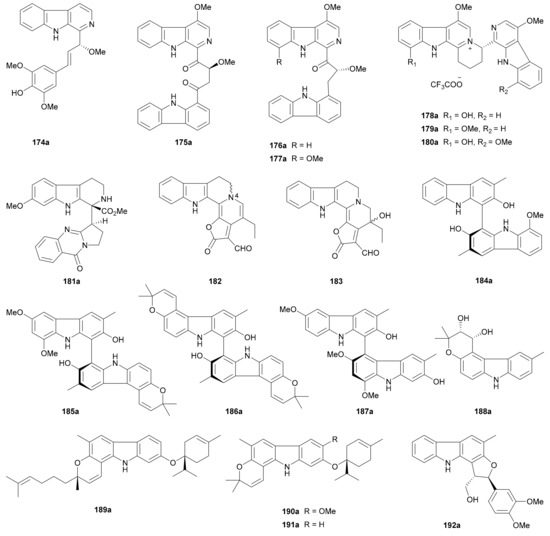 β-Carbolines and carbazoles are among the most intriguing alkaloid groups; they derive from various sources. They have gained increasing attention due to their broad spectrum of biological activities [106,107]. Seven β-carboline (174, 178−183), three β-carboline-carbazole hybrid (175−177) and nine carbazole (184−192) enantiomer pairs have been reported in this period (for structures, see Figure 10; for names, see Table S10 in Supplementary Materials). The abs. configs. for all separated enantiomers in this section were determined by the TDDFT-ECD method unless otherwise specified.