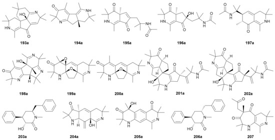 The biogenetic origins of these piperidines, especially of those with highly complex skeletons and multiple chiral centers like 198 and 201–202, have not been examined, and this intriguing puzzle definitely deserves further investigations.