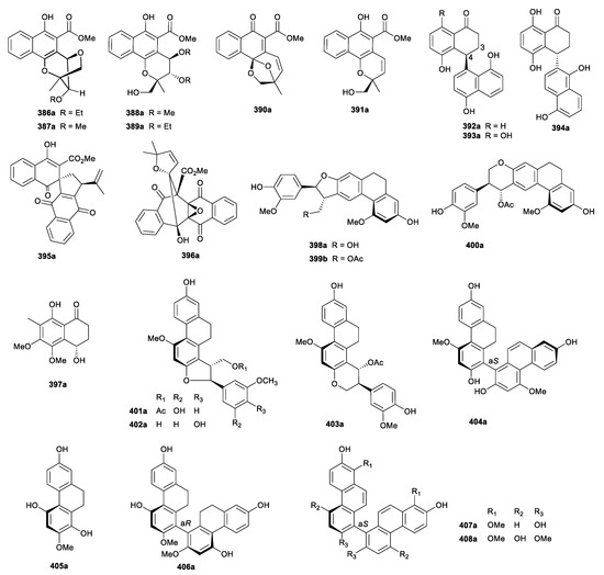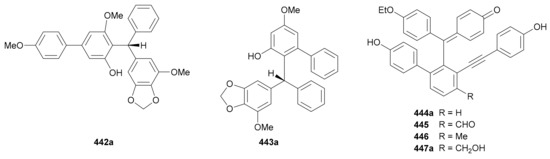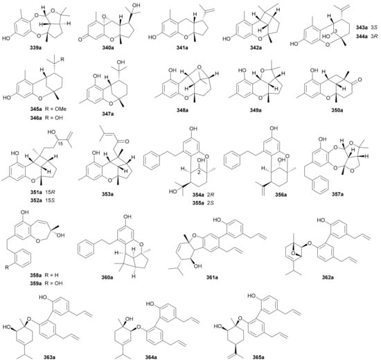 Sesquineolignans refer to lignans bearing three phenylpropanoid units with various connection patterns. Ten pairs of enantiomeric sesquineolignans were reported in this period, and their structures are shown in Figure 5, with the names being listed in Table S5 in Supplementary Materials.