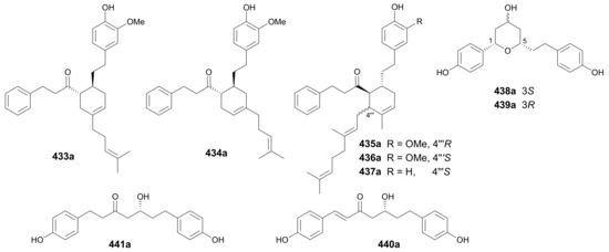 Simple phenylpropanoids are naturally occurring phenolic substances containing only one C6-C3 biosynthetic block. They often exist as racemic or scalemic mixtures in nature (for structures, see Figure 7; for names, see Table S7 in Supplementary Materials). They are also derived from the Shikimate biosynthetic pathway [1]. Many phenylpropanoids play vital roles in plant growth regulation and pathogen defense by acting as essential components of cell wall, as protectants against high light and UV radiation, and as phytoalexins against herbivores and pathogens [69]. It is generally difficult to acquire high quality crystals for X-ray diffraction analysis due to the rotary nature of the sidechains in most phenylpropanoids, so normally their rel. configs. are assigned by J values and the abs. configs. are determined on the basis of Snatzke’s rule, modified Mosher’s method or TDDFT-ECD calculation.
