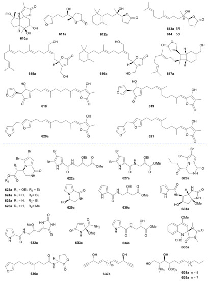 - Afifi, A.H.; Kagiyama, I.; El-Desoky, A.H.; Kato, H.; Mangindaan, R.E.P.; de Voogd, N.J.; Ammar, N.M.; Hifnawy, M.S.; Tsukamoto, S. Sulawesins A-C, Furanosesterterpene Tetronic Acids That Inhibit USP7, from a Psammocinia sp. Marine Sponge. J. Nat. Prod. 2017, 80, 2045–2050. [Google Scholar] [CrossRef]