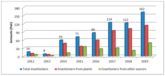 During our research into bioactive NPs from medicinal plants and other sources, we have regularly encountered NP enantiomers and have documented differences in their bioactivities [5,6,7,8,9]. Surveying the scientific literature revealed the aforementioned report by Finefield et al. as the only systematic record of the occurrence of natural enantiomers [3], supported by a 2018 review by Cass et al. on the techniques for separation and absolute configuration (abs. config.) assignment of enantiomeric NPs [10]. This survey also revealed a dramatic increase in the number of publications on natural enantiomers, especially in the last few years. Against this background, the present review seeks to summarize advances in this fascinating field over the period of January 2012 to December 2019.