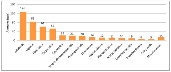 Most quinoline and isoquinoline alkaloids biosynthetically originate from anthranilic acid or from indoles via rearrangement [94]. Quinoline & isoquinoline alkaloids have attracted great interest from researchers worldwide because of their wide-range biological activities, including antitumor, antiparasitic and insecticidal, antibacterial and antifungal, cardioprotective, antiviral, antiinflammatory, hepatoprotective, antioxidant, anti-asthma, antitussive, and other activities [95,96]. The structures and names of these alkaloid enantiomers in the covered stage are summarized in Figure 9 and Table S9 in Supplementary Materials, respectively.
