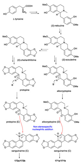 Compounds 153−158 are a series of isoquinoline enantiomers, among which 154a/154b were acquired from Corydalis hendersonii in 2016 [99] and the others were obtained from Corydalis mucronifera in 2018 [100]. Compounds 154a/154b were proposed to be derived from the condensation of a benzylisoquinoline and a succinic acid [99]. In 2016, Hua and colleagues reported from Macleaya cordata five dihydrobenzophenanthridine enantiomer pairs 159−163 and a racemate 164, among which 162 and 163 had been previously isolated in racemic form from Macleaya cordata [101] and here is the first record of their chiral separation [102]. Three same type of enantiomer pairs 165, 166 and 173 were isolated and characterized from Corydalis ambigua var. amurensis by Han and coworkers, and three racemic mixtures 167−169 were also acquired and analyzed by chiral chromatography but without further separation due to their limited amount [103]. As for structure elucidation, single-crystal X-ray diffraction analysis was applied to determine the abs. config. of 165a, followed by the abs. config. assignments for 165b and 166a/166b via comparing the ECD curves with that of 165a. In addition, Ye’s group reported a pair of berberine-type alkaloid enantiomers 170a/170b from Coptis chinensis in 2014 [104]. Sai et al. discovered from Corydalis ambigua two pairs of alkaloid dimers 171a/171b and 172a/172b, featuring a novel dimerization pattern from two different types of monomers via a C–C single bond [105]. The plausible biosynthetic pathways for 171 and 172 were also proposed as shown in Scheme 3 by the authors, and the nonstereospecific nucleophilic addition was assumed to be the key factor to generate enantiomers [105]. As with the aforementioned indole alkaloids, the assignments of abs. configs. for most quinoline and isoquinoline enantiomers have been based on the TDDFT-ECD method.