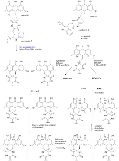 - Zhong, W.; Wang, J.; Wei, X.; Fu, T.; Chen, Y.; Zeng, Q.; Huang, Z.; Huang, X.; Zhang, W.; Zhang, S.; et al. Three pairs of new spirocyclic alkaloid enantiomers from the marine-derived fungus Eurotium sp. SCSIO F452. Front. Chem. 2019, 7, 350. [Google Scholar] [CrossRef]