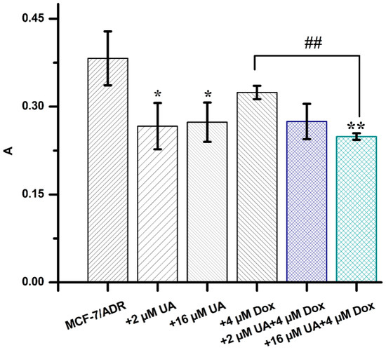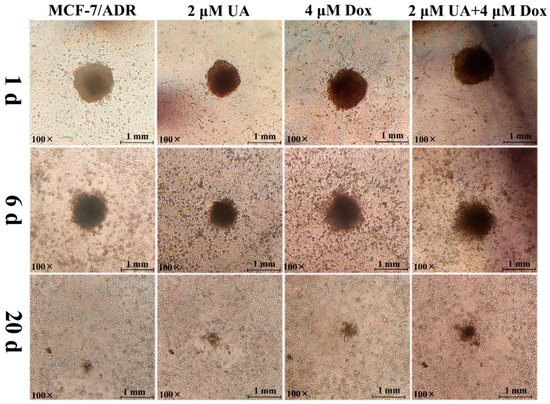 The effect of UA on the intracellular levels of Dox in MCF-7/ADR MCTs was analyzed by flow cytometry. MCTs in the 96-well plate were obtained using the methods of Section 4.5. After 4 days, 100 μL of culture medium was aspirated for each well, and another 100 μL of fresh culture medium containing 20 μM Dox, 20 μM Dox in combination with 4 μM UA, 16 μM UA, or 32 μM UA was added, respectively. The spheroids with the same diameter and volume were used for the assay; each group contained 12 parallel wells. After 48 h of culture, four MCTs in each group were combined, centrifuged in 4 °C PBS, and trypsinized for 10 min to allow full dispersion into a single-cell suspension, and the culture medium was then added to inactivate trypsin. The cell pellets were washed twice with 4 °C PBS. The fluorescence intensity of intracellular Dox was determined by an AccuriTM C6 Plus flow cytometer (BD Biosciences, USA). Traditional 2D monolayer-cultured cells treated with 2 μM UA + 10 μM Dox, 8 μM UA + 10 μM Dox, and 16 μM UA + 10 μM Dox for 48 h were used as the control group, and sample treatment was the same as that of MCTs. Each measurement was performed on at least 10,000 cells. The cell population was selected from the scatter plot. Dox has a maximum emission wavelength of 591 nm at the excitation wavelength of 488 nm, and the amount of Dox was recorded as the mean fluorescence intensity in the PE channel. The data were analyzed using the FlowJo software (Treestar, Ashland, OR, USA).