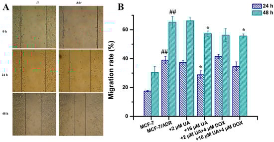 The effect of UA on the migration ability of MDR cells was determined by the wound healing assay. Three horizontal lines were evenly drawn at the bottom of the 6-well plate with the black marker. MCF-7/ADR and MCF-7 cells (4 × 105 cells per well) were seeded in the 6-well plates; the corresponding drugs were added after overnight adhesion (2 μM UA, 16 μM UA, 4 μM Dox+2 μM UA, and 4 μM Dox+16 μM UA) and cultured for 48 h to reach 100% confluence. There were 3 parallel wells in each group. Then, 3 lines perpendicular to the horizontal line were carefully drawn with a 1 mL pipette tip. The cells were washed twice with ice-cold PBS to remove floating cells and images were captured under an inverted microscope at 0 h, 24 h, and 48 h. The migration rate (%) = (0 h wound width − 24 h/48 h wound width)/0 h wound width × 100%. Each group had 3 parallel wells.