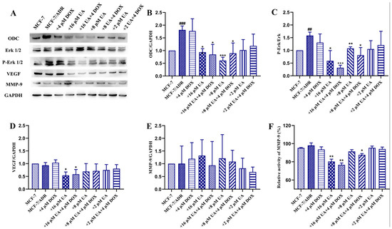Therefore, the inhibition of UA on the invasion and metastasis of doxorubicin-resistant MCF-7/ADR cells was investigated in this work. In addition, to explore the underlying molecular mechanism of UA in the invasion and metastasis of breast cancer cells with MDR, we also studied the expression levels of ODC, MMPs, MAPK/Erk, and VEGF signaling proteins, and the metabolic pathways of polyamine.