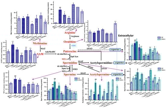 The quantitative analysis of metabolites involved into the polyamine metabolic pathways. SAM, S-adenosylmethionine; MTA, 5’-methylthioadenosine; Put, putrescine; Spd, spermidine; Spm, spermine; Aceytlspm, N-acetylspermine; Orn, ornithine; Arg, arginine; Met, methionine. * p < 0.05, ** p < 0.01 compared with MCF-7/ADR cells, # p < 0.05, ## p < 0.01 compared with MCF-7 cells.