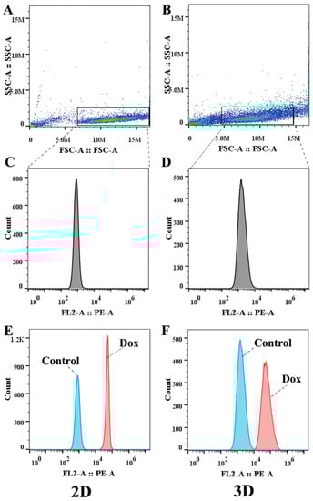 The results measured by flow cytometry. (A,B) are the scattergrams of cells cultured in 2D and 3D. (C,D) are the histograms of gated cells cultured in 2D and 3D. (E,F) show accumulation of Dox in 2D and 3D cells.