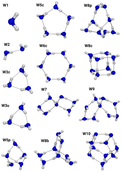 Figure 1 depicts the regular water clusters, with oxygen atoms colored blue and hydrogen atoms colored white. Their sizes range from the water monomer, W1, to a decamer cluster, W10. The trimers, W3c and W3u, as well as the clusters W5c and W6c exhibit exclusively two-fold hydrogen bond motifs, i.e., each water molecule accepts and donates one hydrogen bond. Three-fold hydrogen bond coordination can be found in clusters W5p, W8c, W8p, and W10. A four-fold hydrogen bond pattern is present in the clusters W7, W8b, and W9.