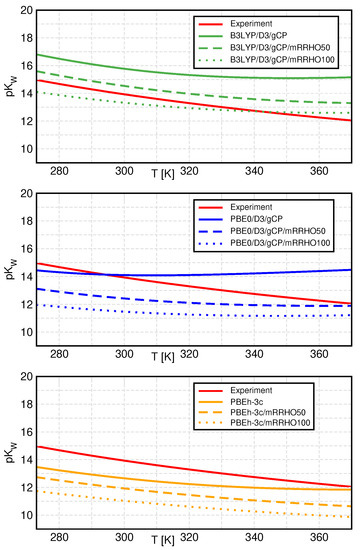 In Figure 3, we compare the temperature dependence of between standard QCE and mRRHO-QCE for all three investigated methods (top: B3LYP, middle: PBE0, bottom: PBEh-3c, all with D3 and gCP). In general, the application of mRRHO leads to decreasing values of , which translates to an increasing ionic product, and hence, larger ion concentrations in the liquid phase. Consequently, we see an improvement in the results for B3LYP, which predicted slightly too large values for in the standard QCE model. PBE0, which produced the best data in the standard QCE approach, is now underestimating . The same is observed for PBEh-3c, which already resulted in the smallest values within the standard RRHO model.