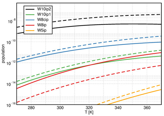 To substantiate our observations for the ionic product, we consider the populations of ion pair clusters in Figure 4 and regular clusters in Figure 5, using once again B3LYP/D3/gCP as a representative example (see Figures S1 and S2 for results obtained with mRRHO100). All ion pair clusters but W8ip show increased populations if treated with the mRRHO50 approach. The population of W8ip is significantly reduced. It is interesting to note that W8ip shows three modes below 50 cm−1 while the others exhibit none or only two (see Table 2). Keeping in mind that the y-axis has a logarithmic scale, it is clear that W10ip2 is the dominating ion pair cluster, causing the overall increase in .