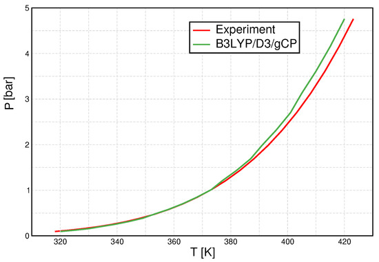 Pressure–temperature graph for B3LYP/D3/gCP (green line) and compared to experimental [55] data (red line).