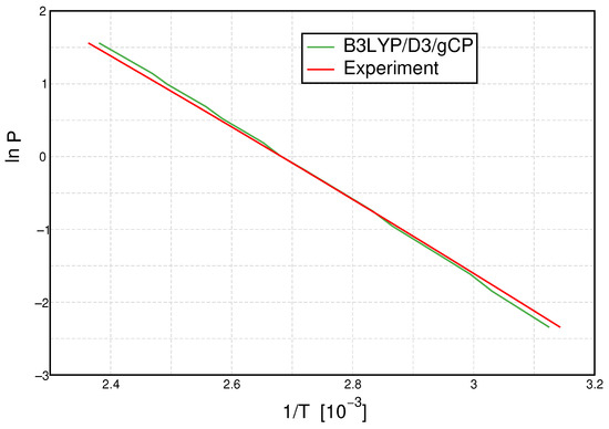 Clausius–Clapeyron plot: Logarithmic plot of pressure P versus inverse temperature T for B3LYP/D3/gCP (green line) and experiment [55] (red line).