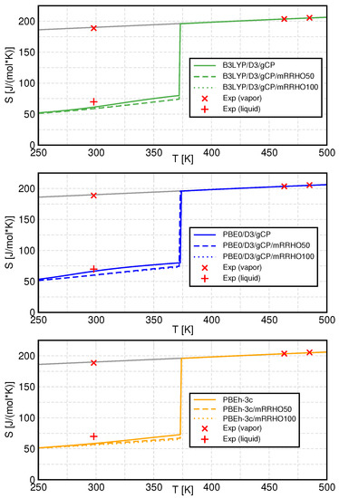 Finally, the entropy of liquid water and water vapor in the liquid range and beyond the phase transition point are presented for the different methods and mRRHO treatments. Calculated and experimental values for the entropy are shown in Figure 8 and phase change data are listed in Table 3.
