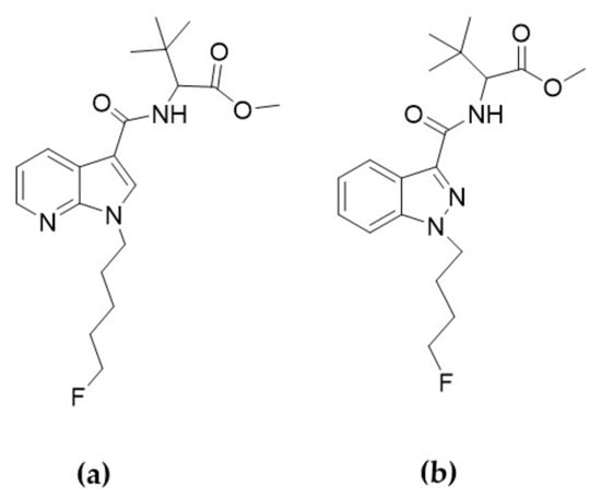 Chemical structures of 7′N-5F-ADB (a) and 4F-MDMB-BINACA (b).